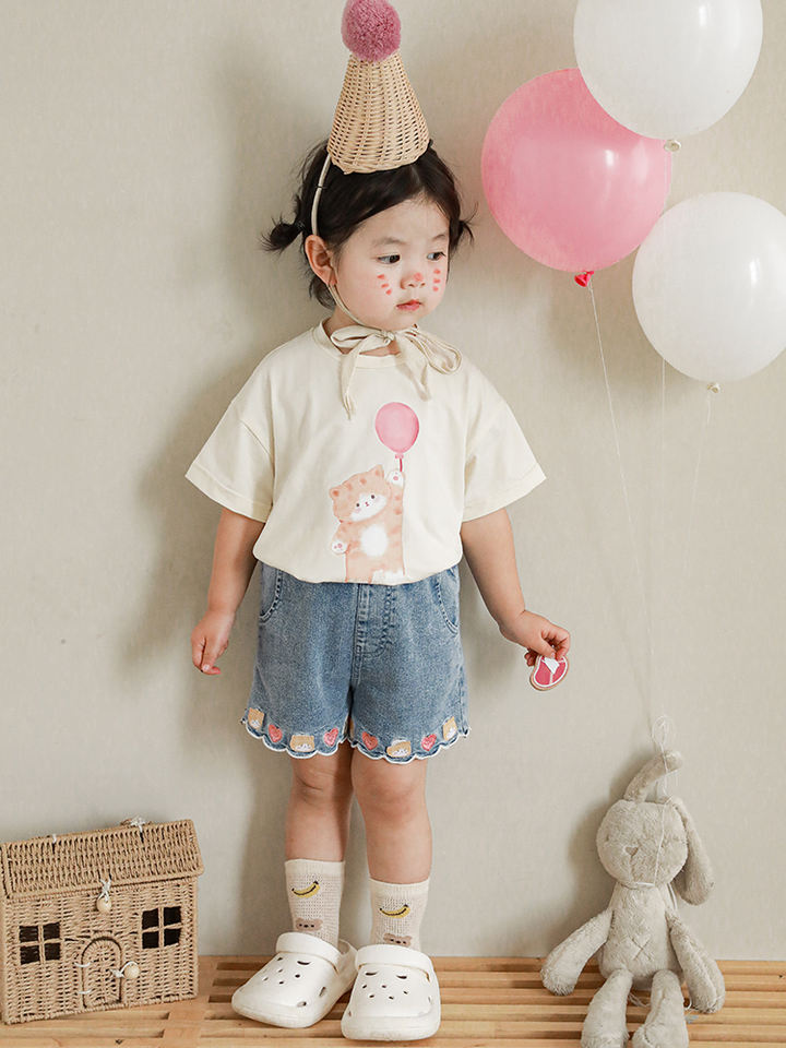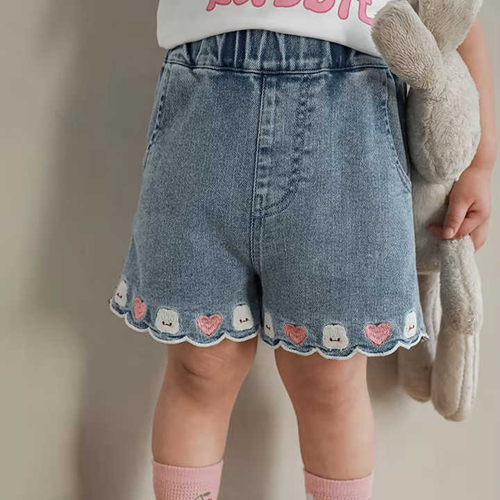 Haut de gamme personnalisé enfants filles dessin animé broderie Jean Shorts bébé enfants vêtements lavé au sable bord ondulé Denim Shorts
