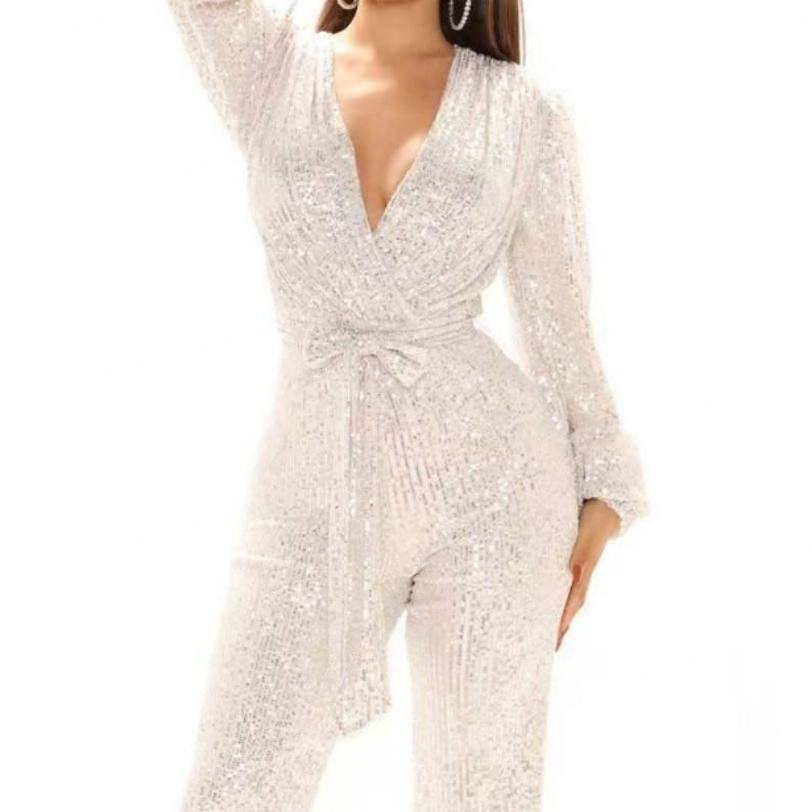 Combinaison sexy de soirée haut de gamme pour femme, à sequins, col en V profond, manches longues