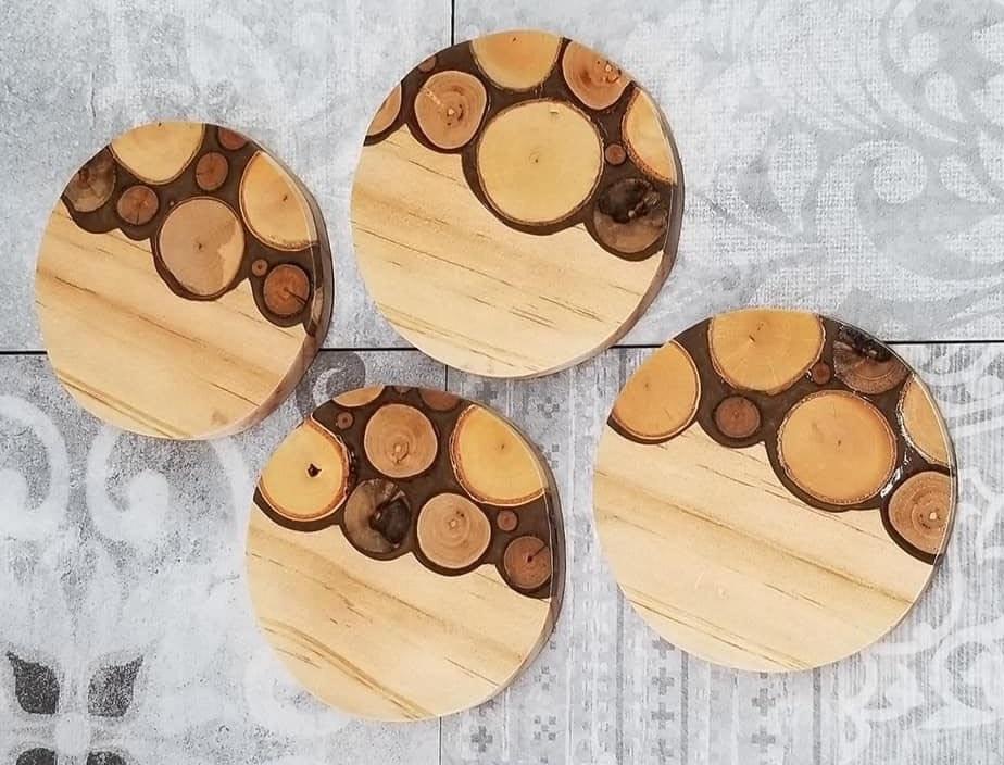 Sous-verres traditionnels en résine époxy naturelle et en noyer de bois à la demande pour salle à manger rustique et café contemporain