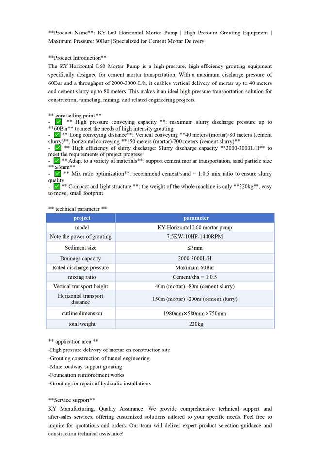 Vertical conveying height:Mortar 40M Cement Slurry 80M