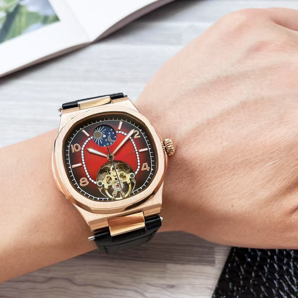 Montre de haute qualité à mouvement mécanique automatique, bracelet en cuir, cadran en cristal saphir, résistance à l'eau 30 bars, style professionnel simple