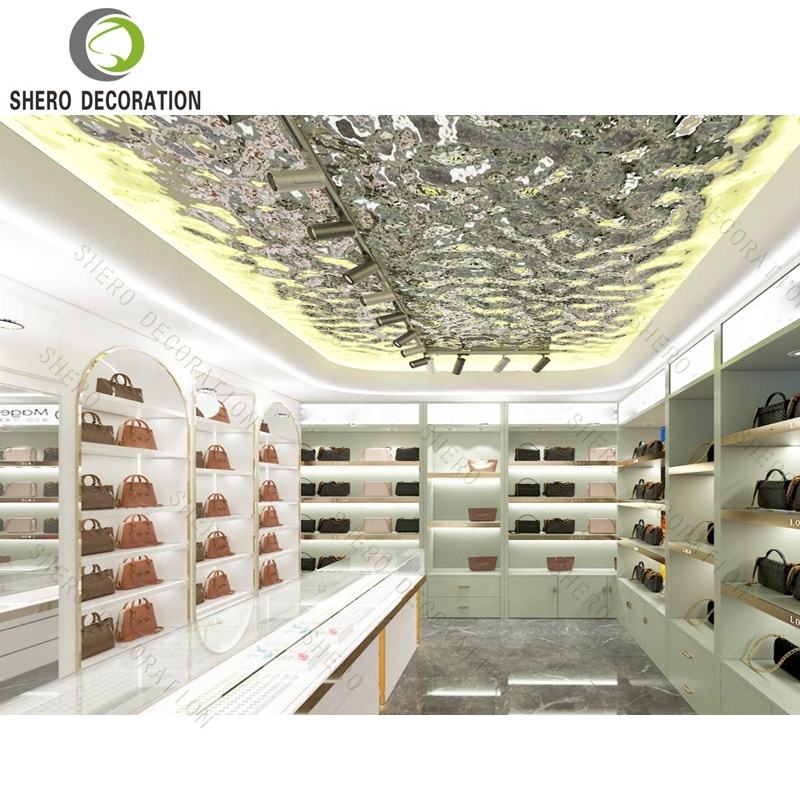 Étagères de présentation de sacs de haute qualité pour boutique de sacs, présentoirs de sacs à main pour femmes, étagères murales en bois pour chaussures avec présentoirs de sacs en métal pour boutique de sacs