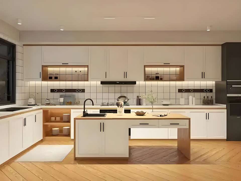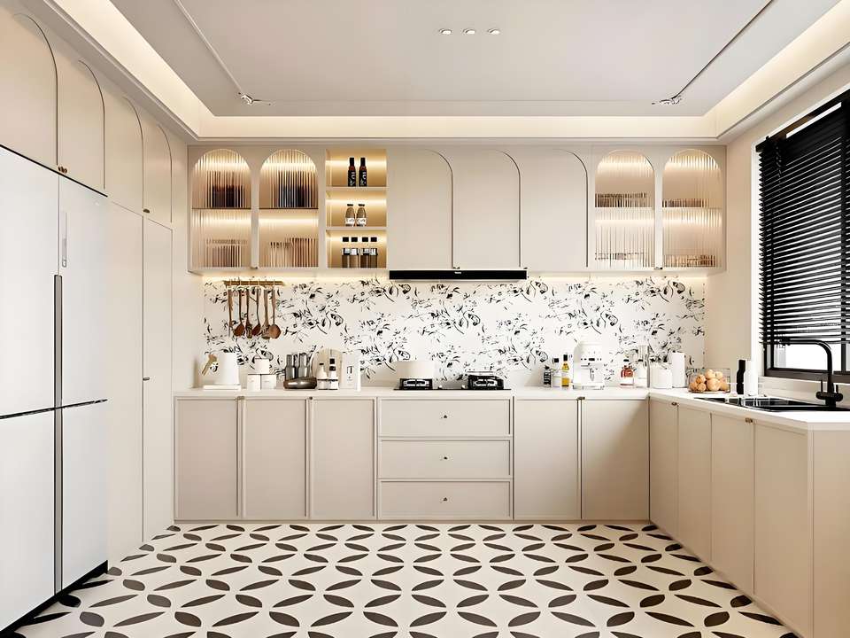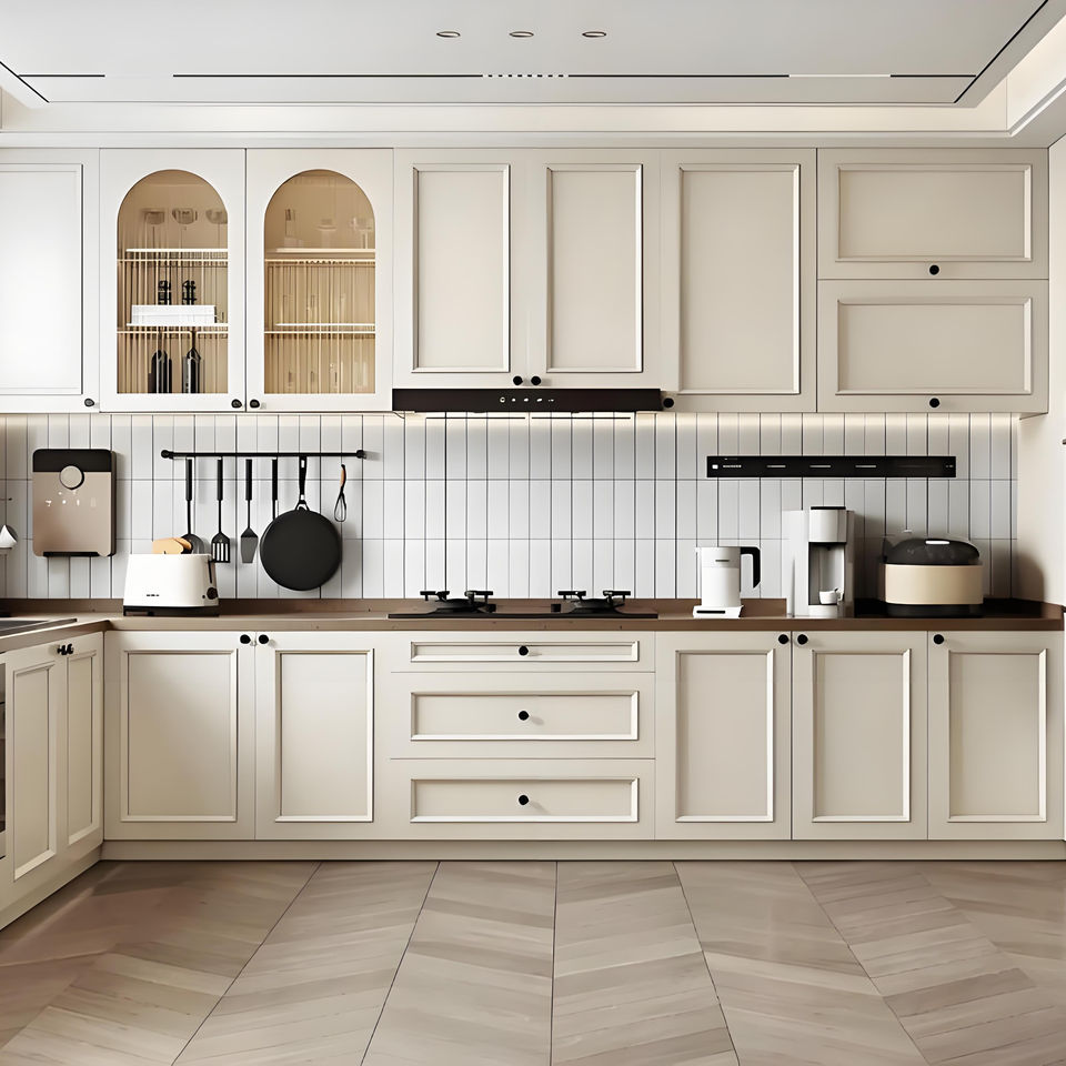 L'usine de conception d'armoires de haute qualité fournit des armoires de cuisine à stockage élevé de style crème sans cadre laqué clair.