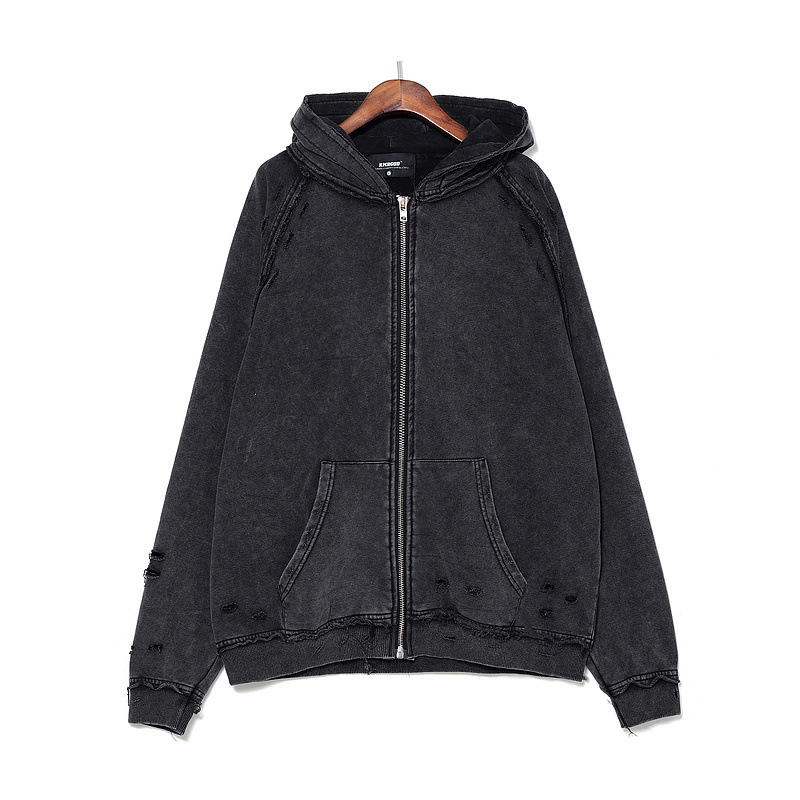 Sweat à capuche à fermeture éclair lourd de haute qualité pour hommes, lavage lourd et pull à capuche à trou en détresse