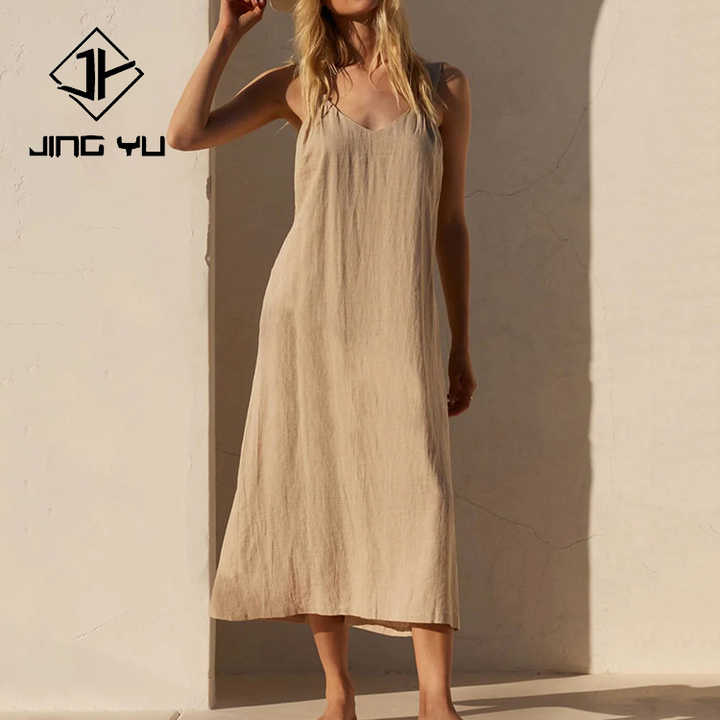 Robe d'été mi-longue en lin mélangé respirant, élégante, ample, confortable, à col en V et dos nu, sur mesure
