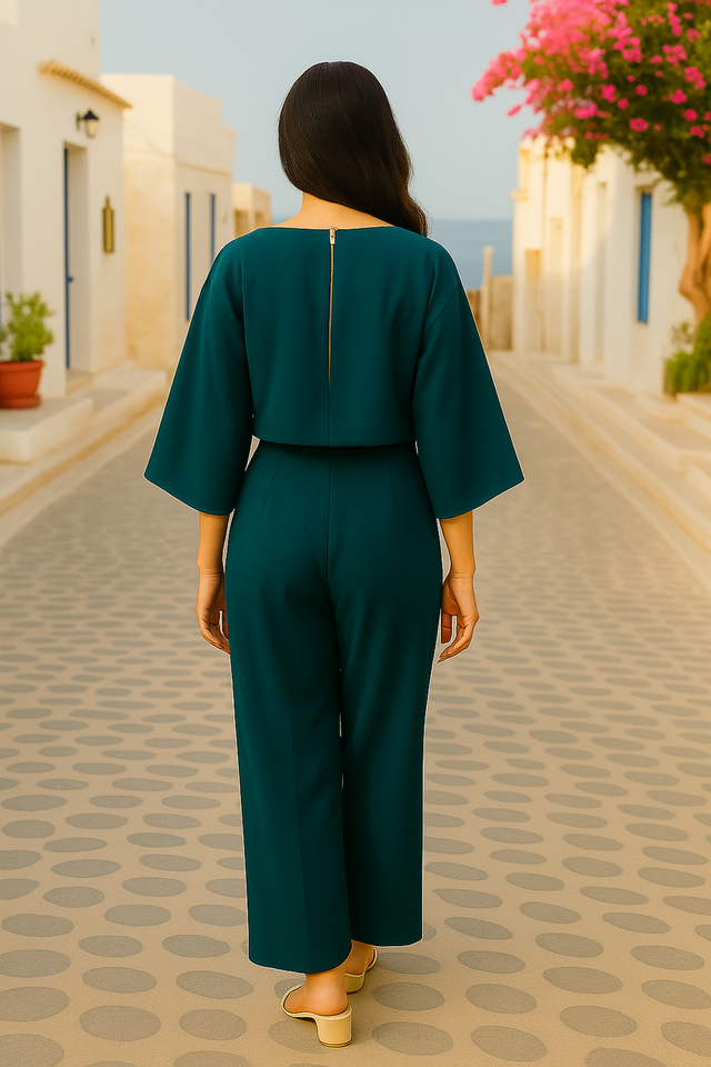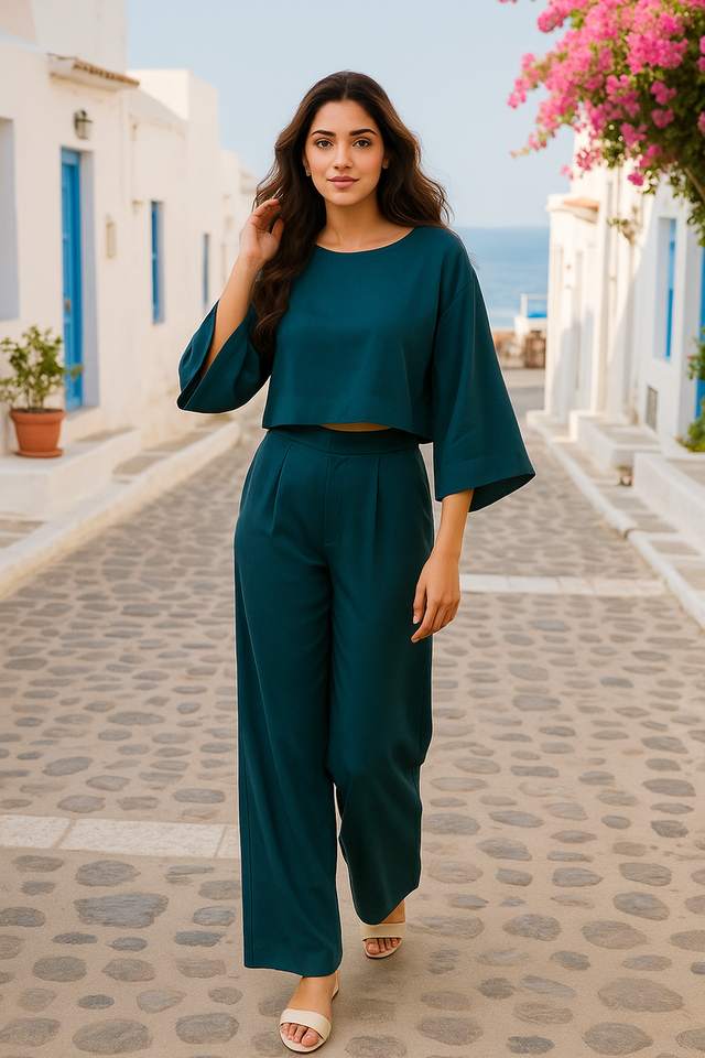 Ensemble deux pièces en polyester bleu sarcelle de haute qualité, haut court et pantalon large, tenue décontractée semi-formelle, tailles M L XL XXL, vente en gros