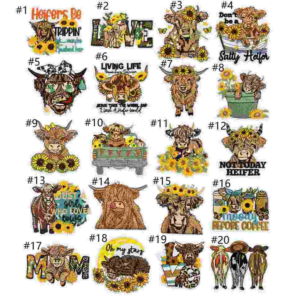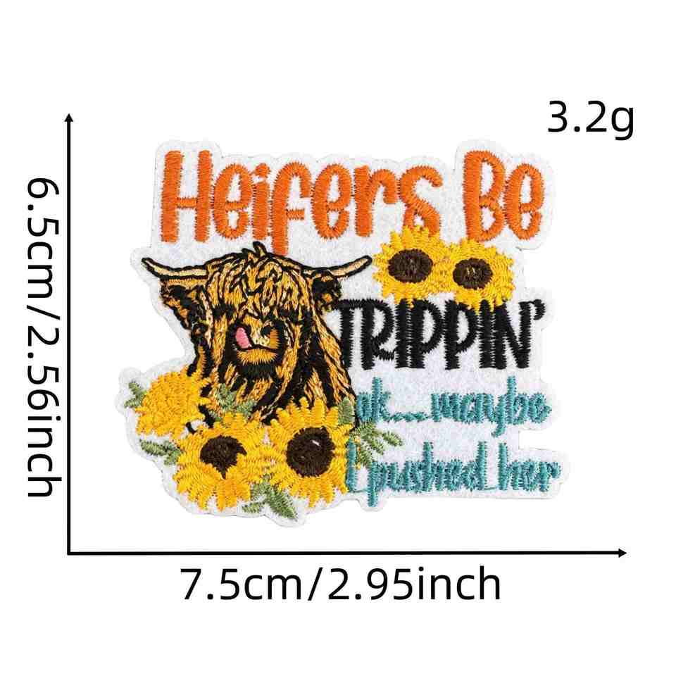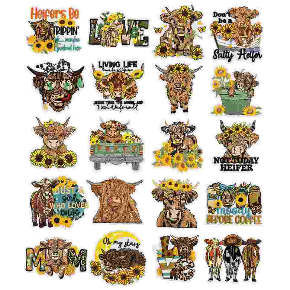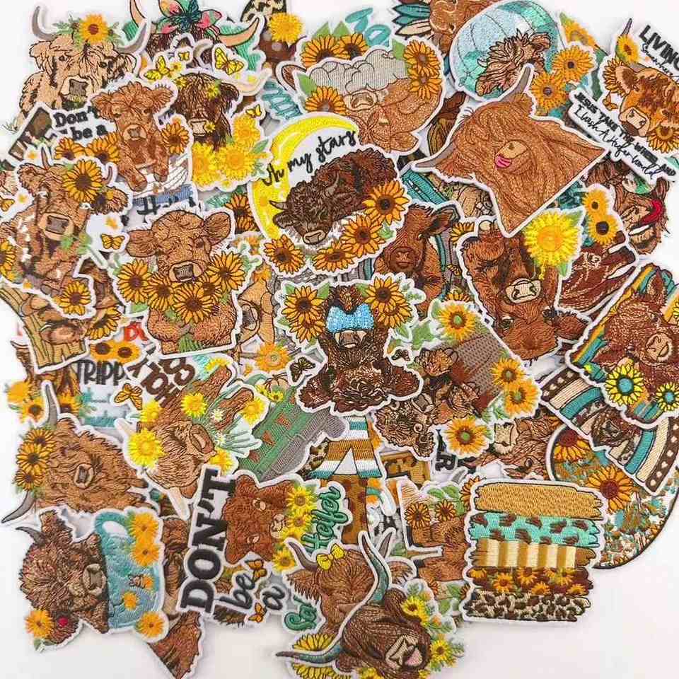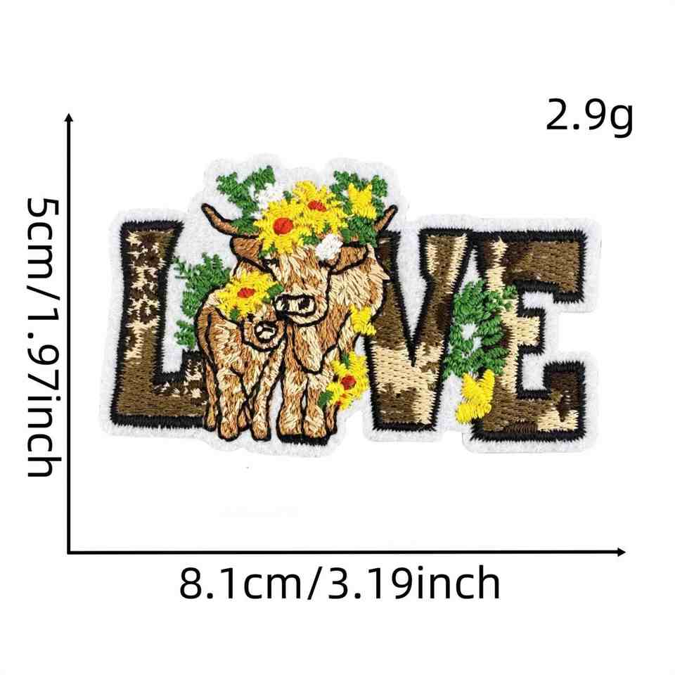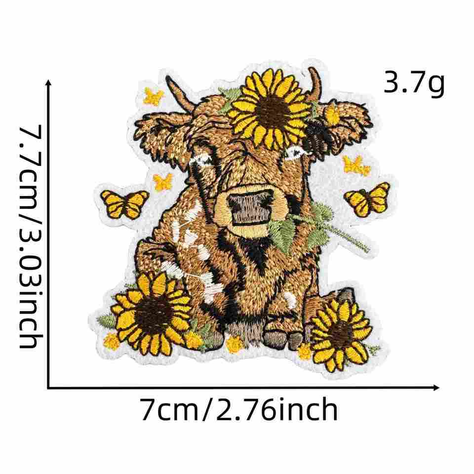 Patchs brodés thermocollants mignons et fantaisistes motif vache des Highlands style champ de fleurs