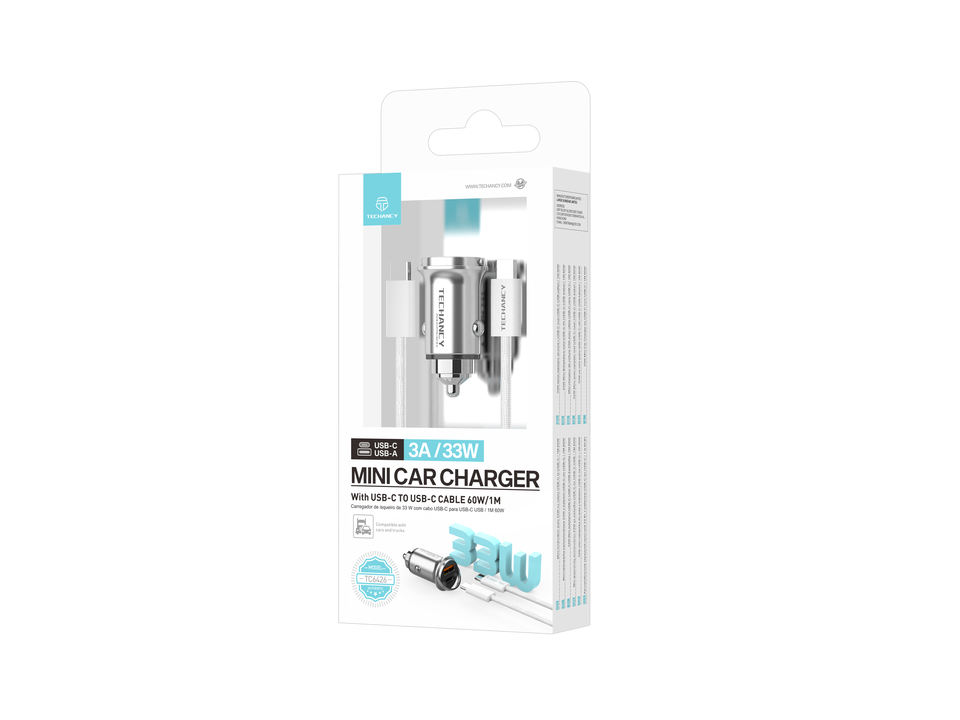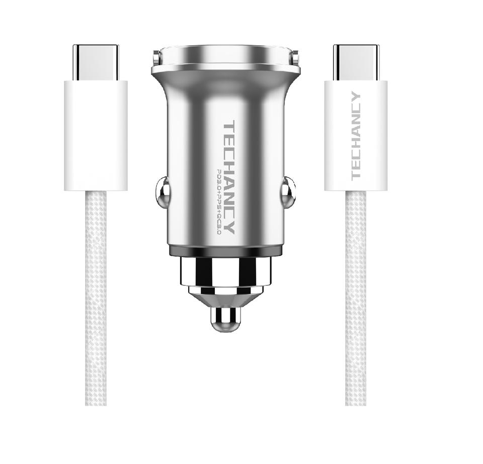 Chargeur de voiture Techancy, prix très raisonnable, électronique de pointe, universel, 2 ports Type-C, 33W, argent métallisé