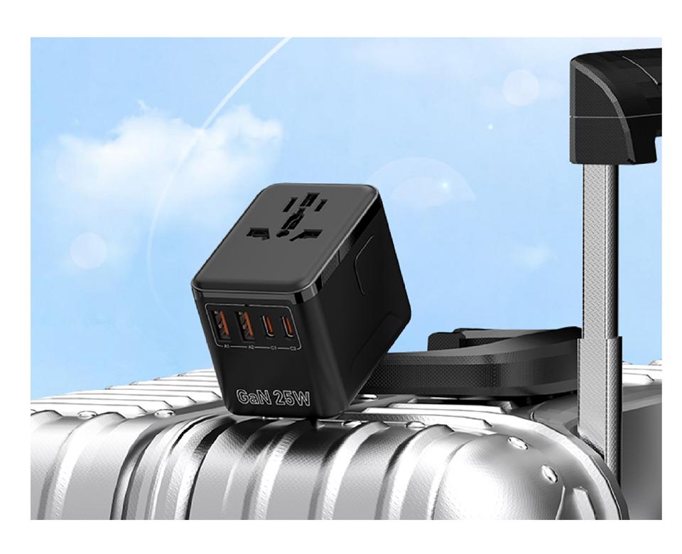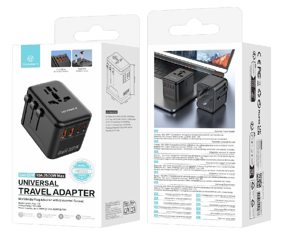 Adaptateur de voyage Techancy hautement recommandé, portable, universel, léger, 25W, 2 ports Type-C, 2 ports USB, avec logo