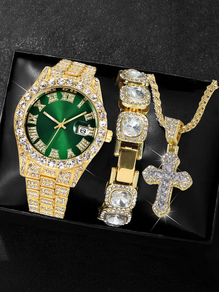 Ensemble de bijoux pour homme Hip Hop, montre et collier bracelet, 3 pièces, montre en alliage avec cadran en strass, calendrier pour homme
