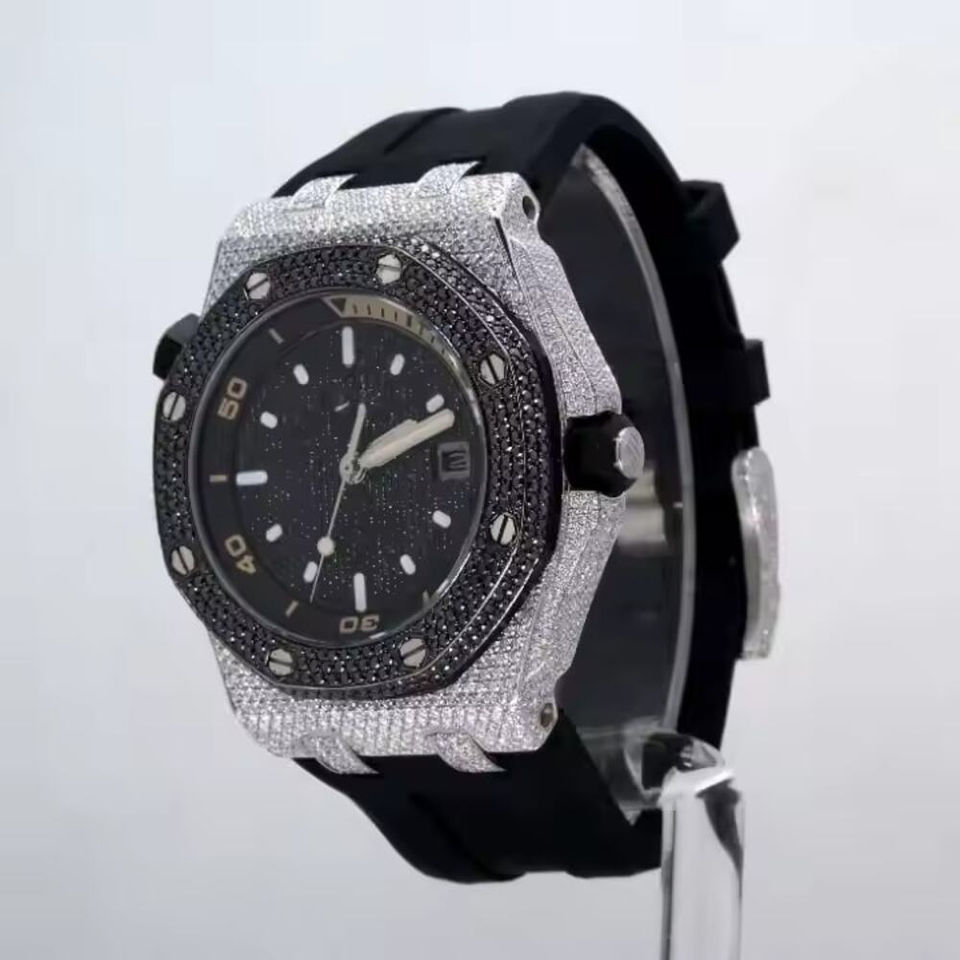 Style Hip Hop Noir et Blanc Rond Moissanite Diamant Noir Couleur Bracelet En Silicone Montre Occasion Spéciale Montre pour Hommes