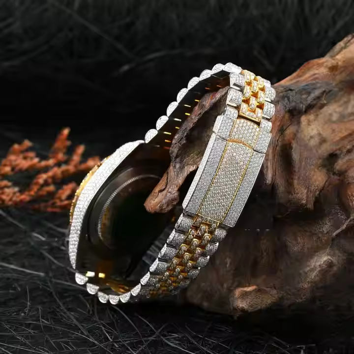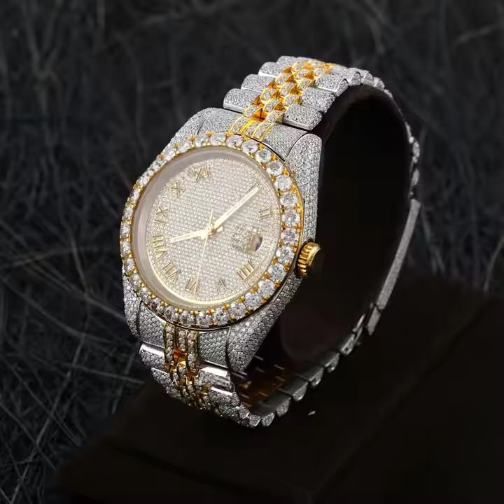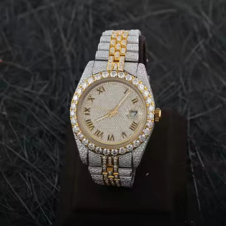 Style Hip Hop Personnalisé VVS Clarity Moissanite Diamant Clouté Montre-Bracelet Cadran Romain Deux Tons En Acier Inoxydable
