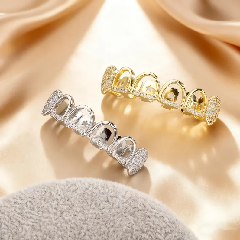 Hip hop jewellery moissanite iced out gold silver grillz star cut open teeth design luxury unisex street style shine