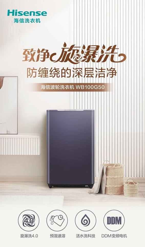 Lave-linge à chargement par le haut entièrement automatique Hisense WB100G50 avec fonction de lavage en cascade 4.0, lavage à l'eau active