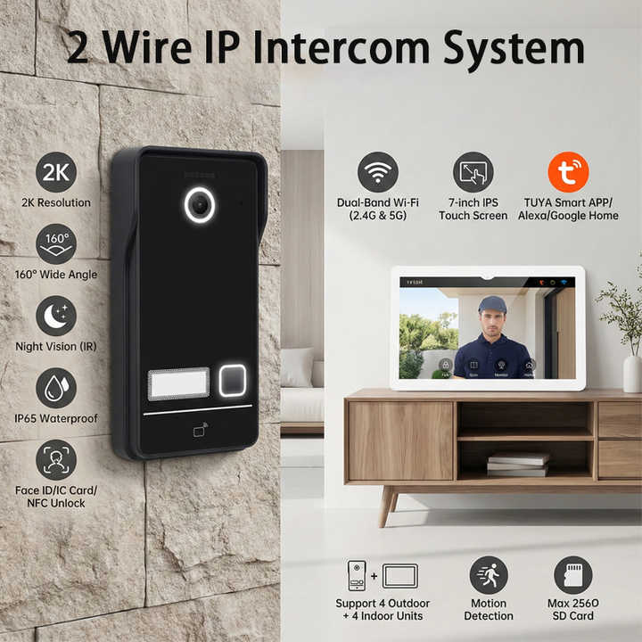 Système d'interphone vidéo intelligent WiFi Tuya Hiwink 2K, 2 fils, visiophone IP avec identification faciale, déverrouillage par reconnaissance palmaire, écran tactile IPS 7 pouces, kit