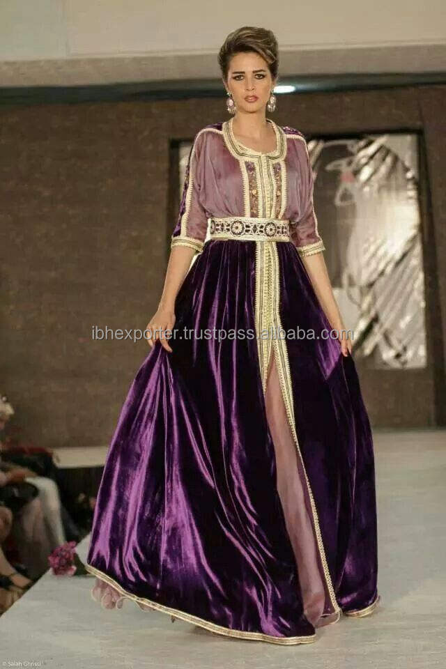 Kaftan à manches courtes de couleur violette avec un bas en tissu velours et un travail de dentelle dorée avec une ceinture attrayante