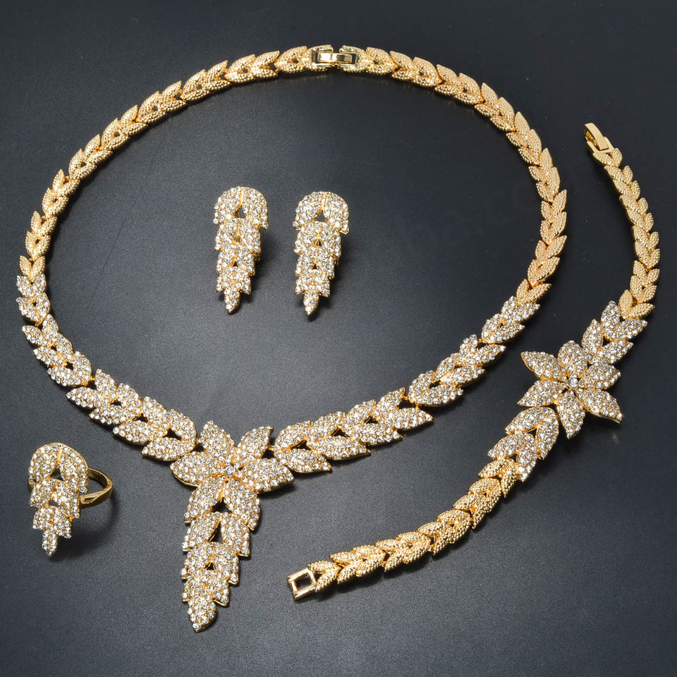 Vente en gros de bijoux de mariage de haute qualité plaqués or, ensemble de bijoux de mariée personnalisé en zircon hawaïen