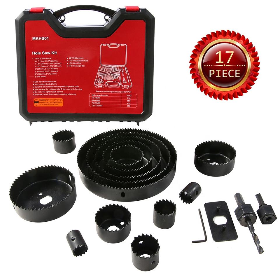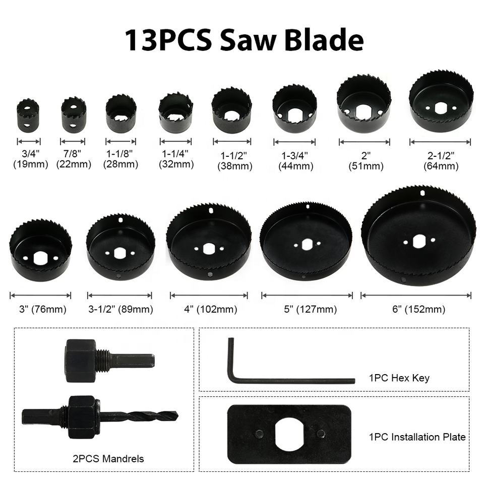Hole Saw Kit, 17 Pcs Hole Saw Set with 13Pcs Saw Blades, 2 Mandrels, 1 Installation Plate, 1 Hex Key