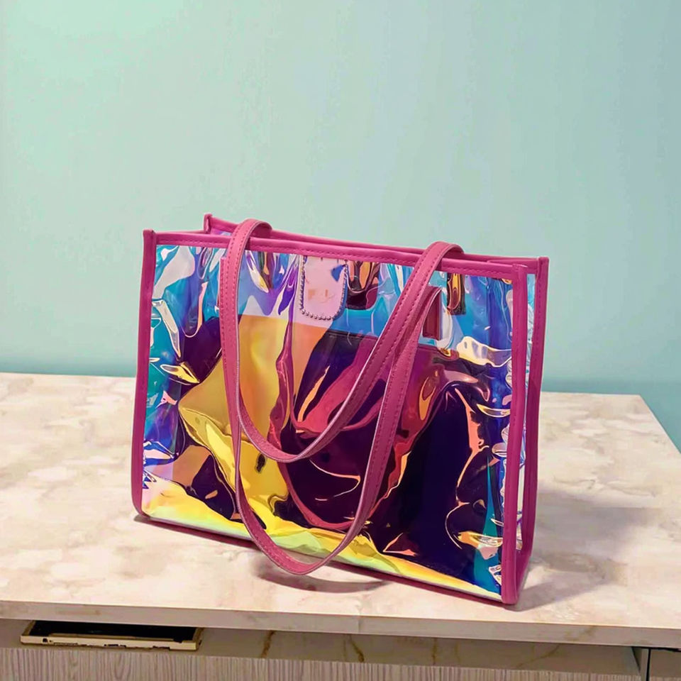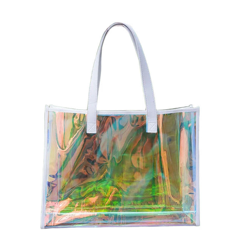 Sac fourre-tout holographique en PVC Sac à provisions de grande capacité transparent irisé Sac à main à bandoulière pour femmes Logo personnalisé Shopping Voyage