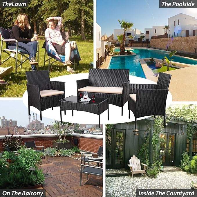 Ensemble de salon de jardin Homall 4 pièces en rotin, mobilier de conversation pour patio, ensemble de sièges de jardin en osier avec coussins