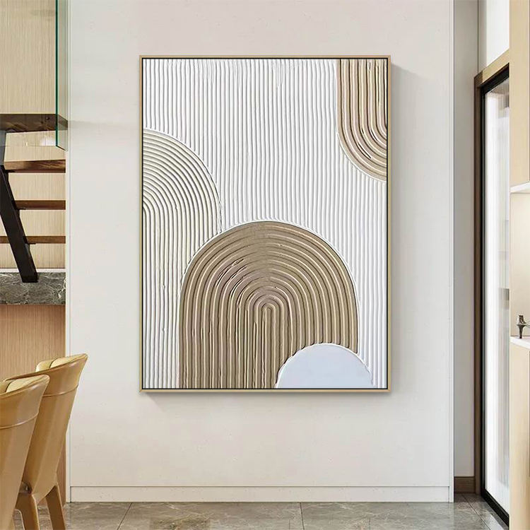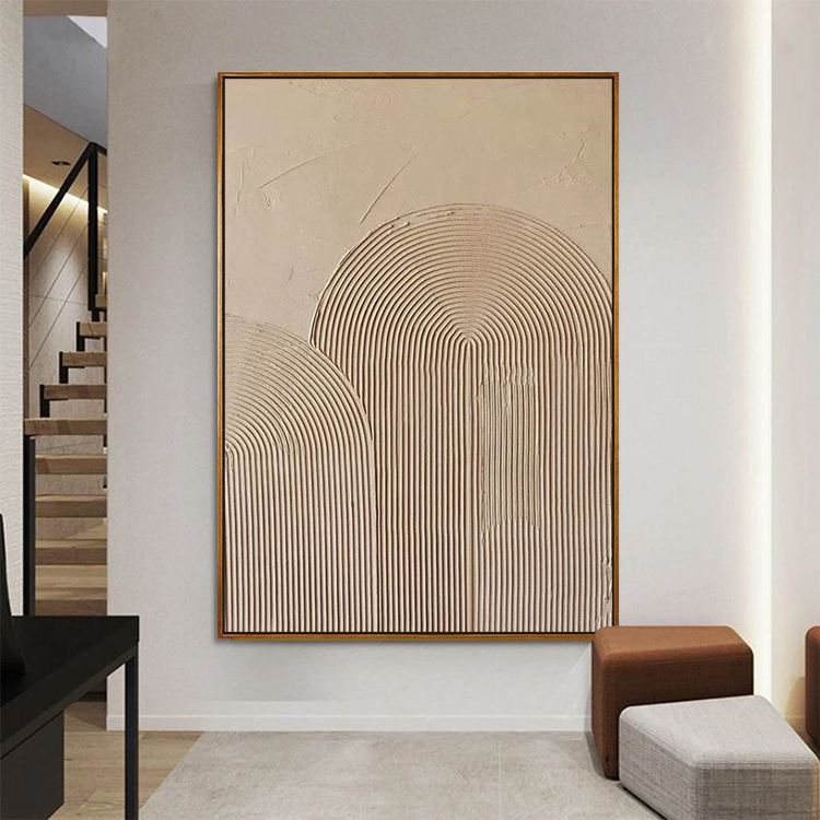 Décoration Intérieure Œuvre d'Art Murale Texturée Faite à la Main sur Toile Beige, Peinture en Plâtre Abstraite Minimaliste Arc 3D Style Wabi-Sabi