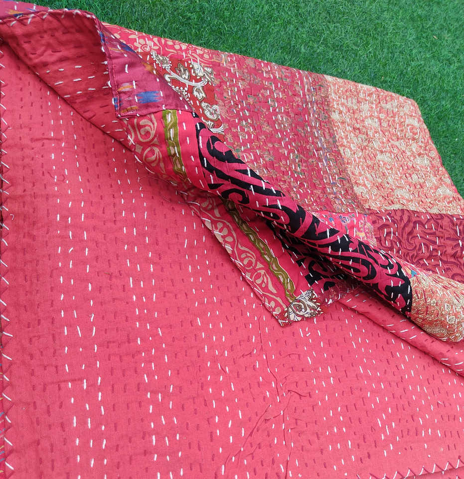 Home Decor Vintage Handmade Silk Saree Patchwork Kantha Quilt Handmade Throw Reversible Blanket