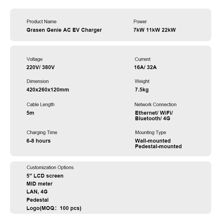 Output Current:1-Phase 7kW 32A 3-Phase 11kW, 16A 3-Phase 22kW, 32A