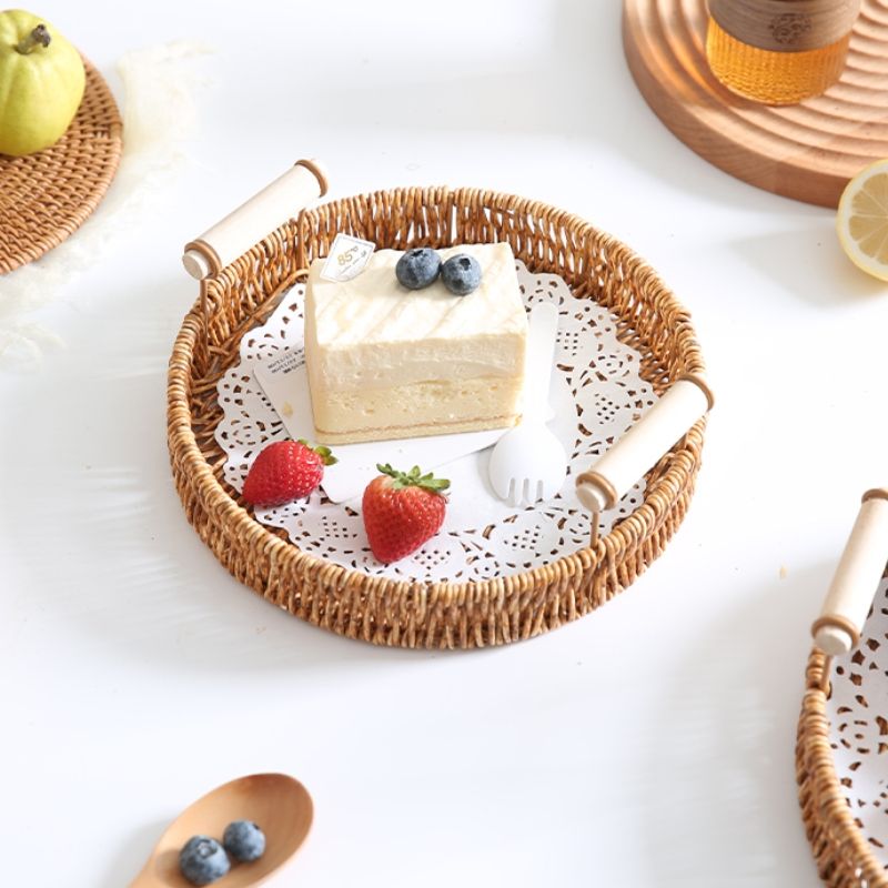 Panier à Pain en Rotin PP Tressé à la Main, Rangement de Fruits et Légumes de Table pour Cuisine, Plateau de Rangement Rond avec Poignée
