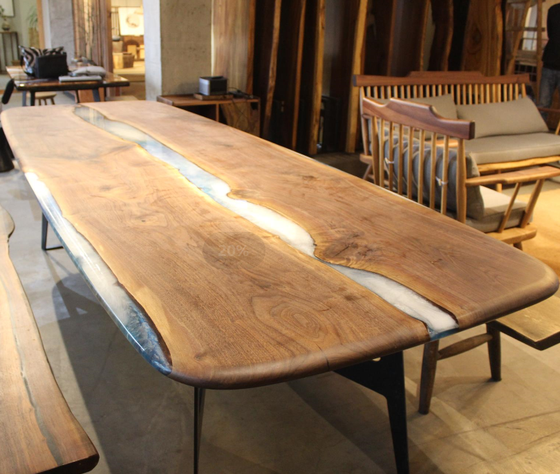 Grande table de salle à manger en bois massif avec résine époxy 3M