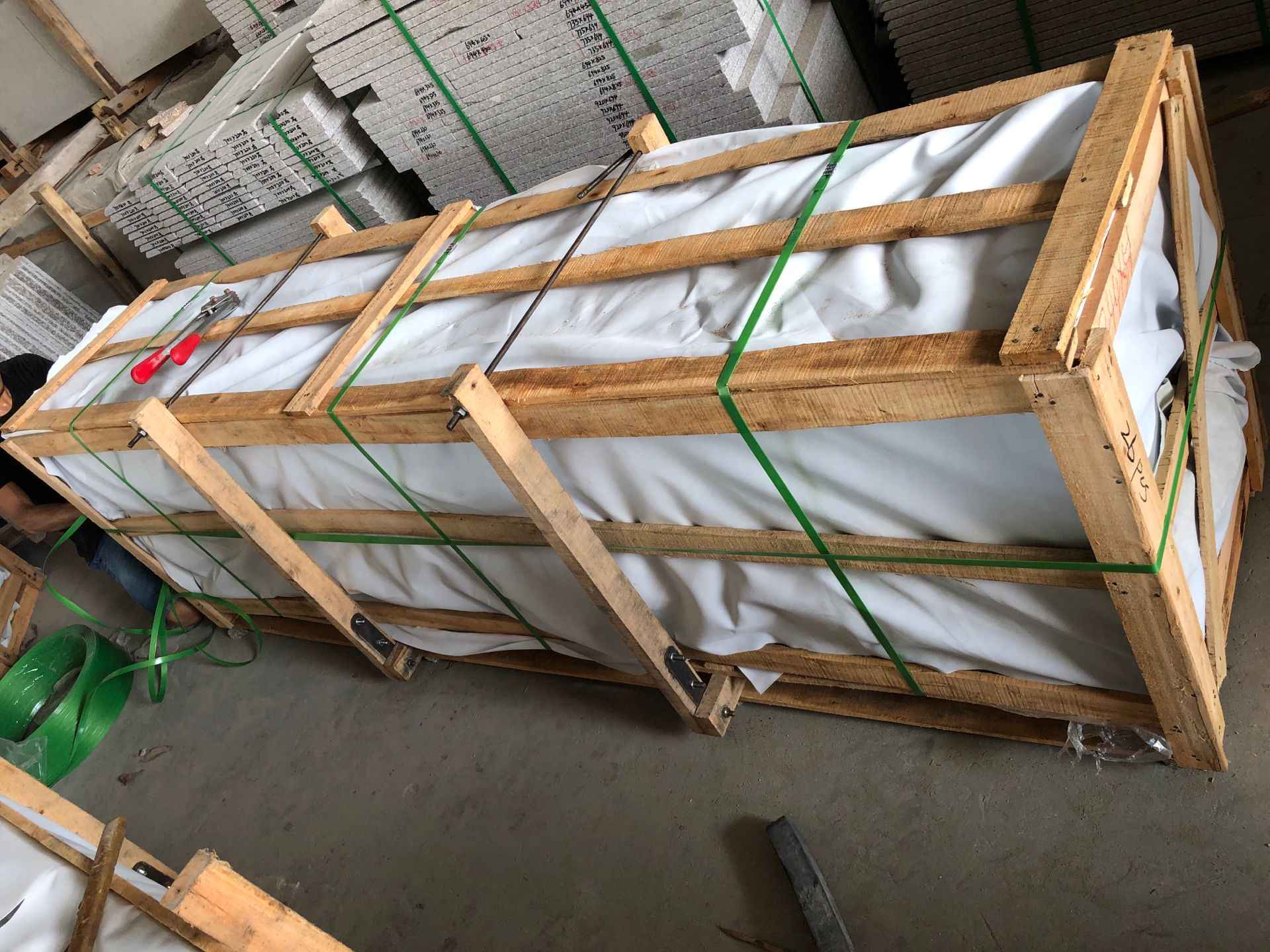inner by foamed plastic and outside strong seaworthy wooden crates, reinforced with metal straps outside