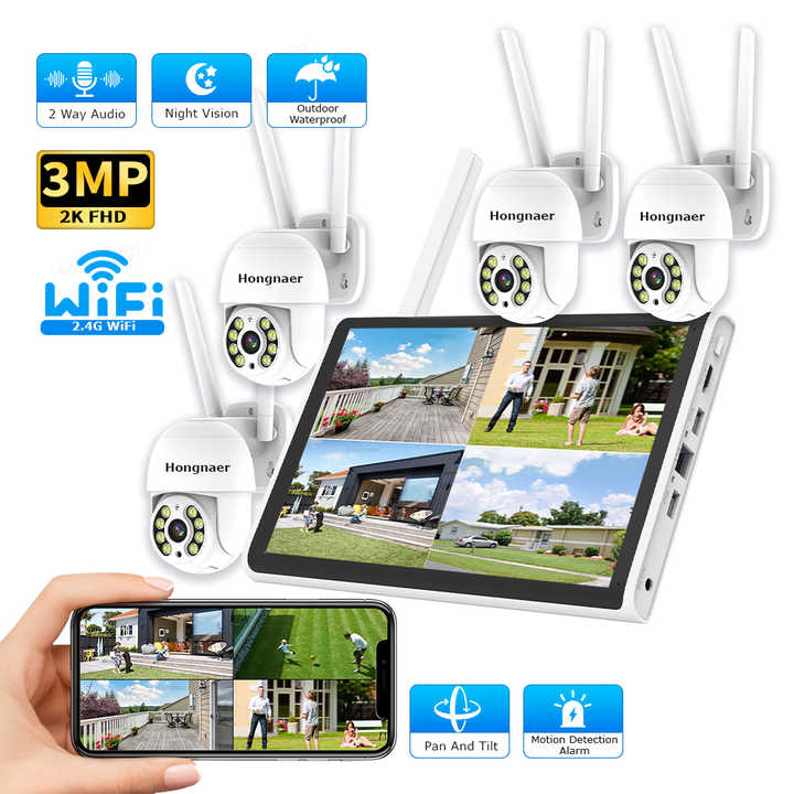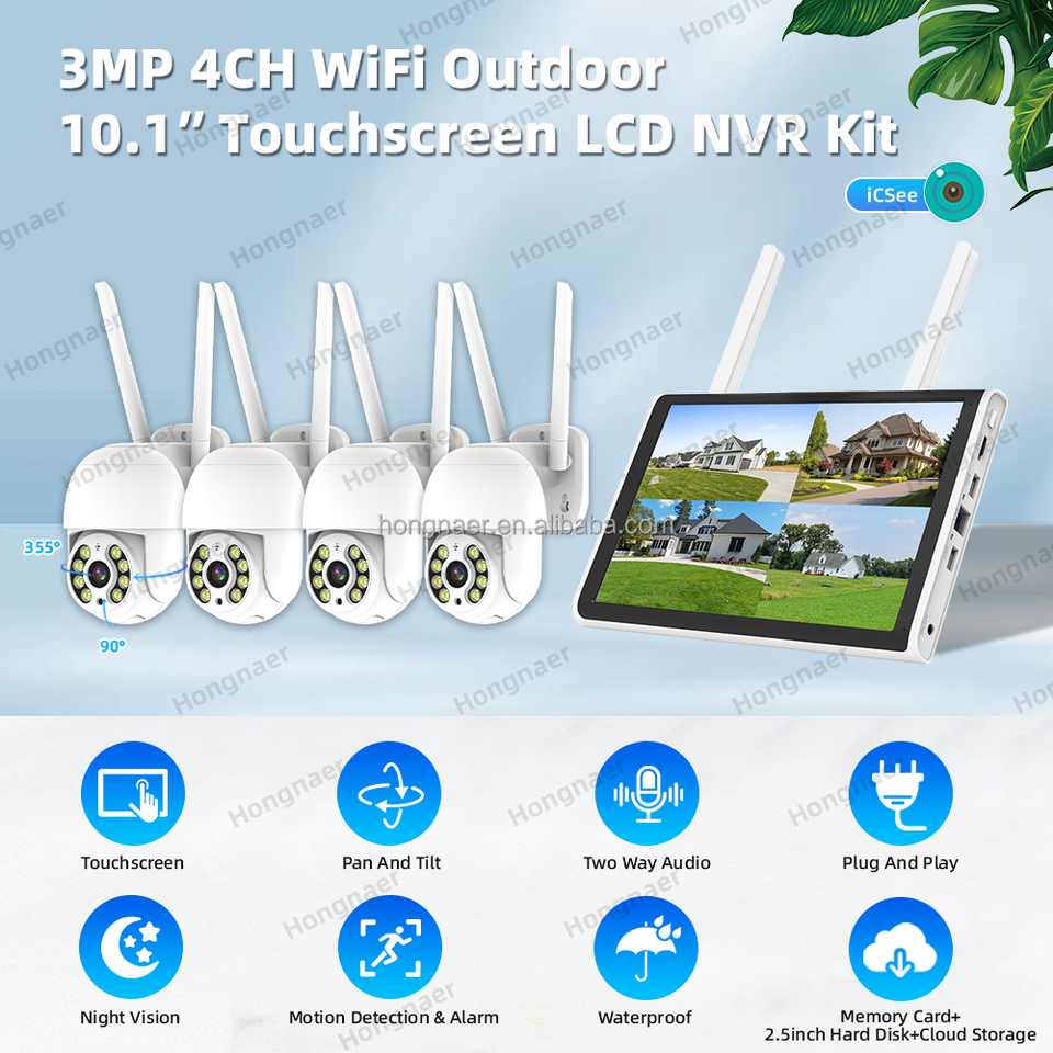 Hongnaer 3MP 4CH NVR Enregistreur vidéo réseau domestique Surveillance WiFi Kit de caméra de sécurité Système LCD IP Système de caméra de vidéosurveillance sans fil