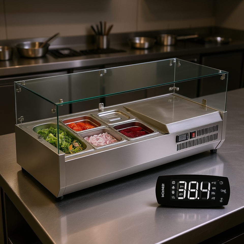 Station de préparation de condiments Honker pour comptoir, 130 W, corps en acier inoxydable 304, 1 bac 1 1/3, 4 bacs 4 1/6, réfrigération pour cuisine commerciale