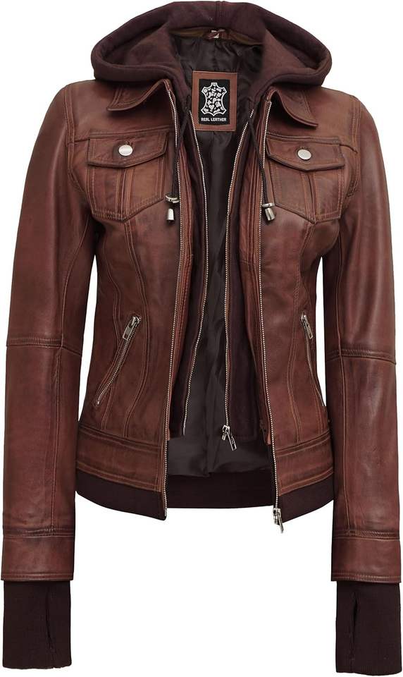 Hooded Leather Jacket Women - Real Lambskin Womens Leather Jacket with Removable Hood