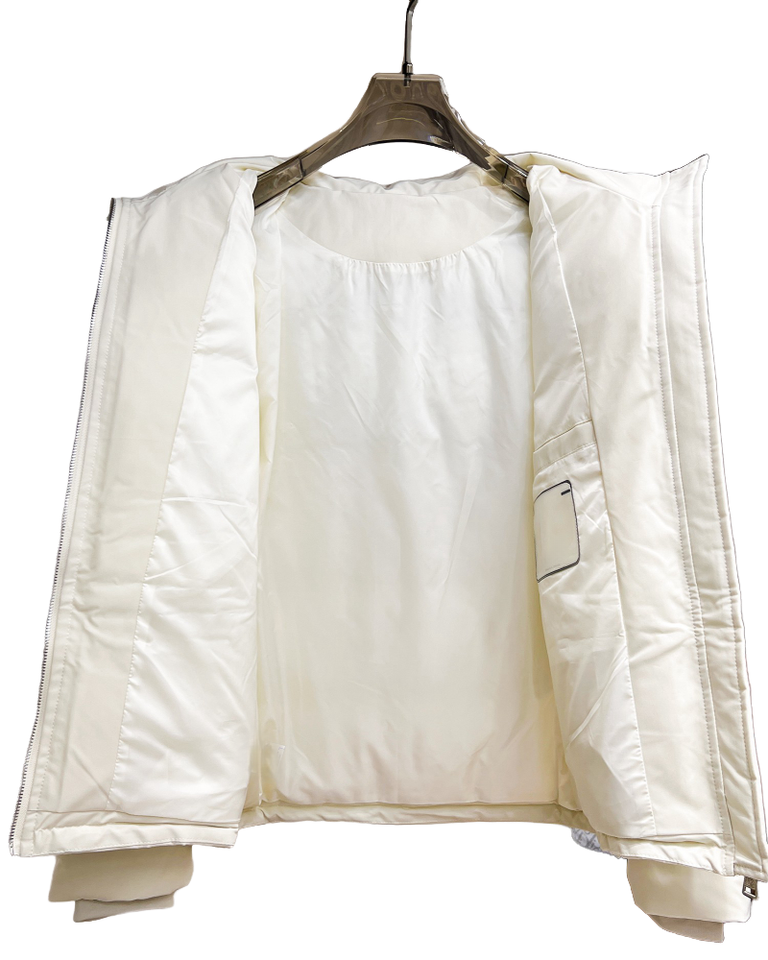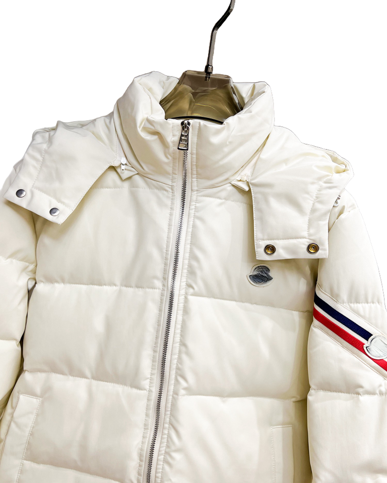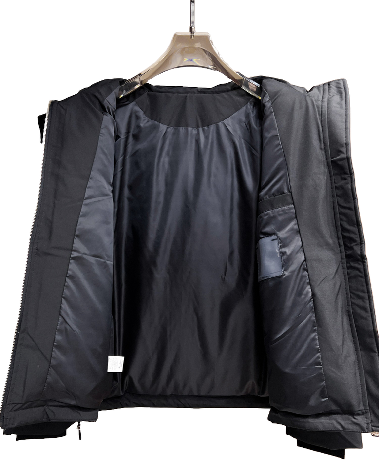Blouson matelassé à capuche noir avec détails métalliques colorés sur les épaules, poignets à rayures rouges, blanches et bleues, matelassé, décontracté, urbain, pour temps froid