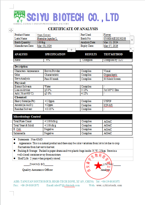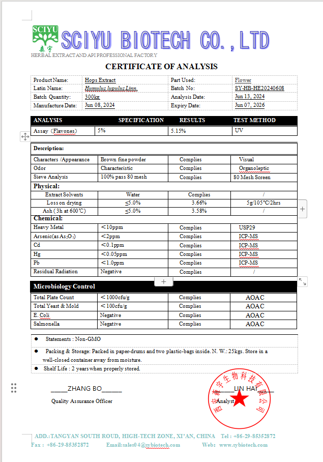 Poudre d'extrait de fleur de houblon Humulus Lupulus 20:1 10:1 Soluble dans l'eau 4% Flavonoïdes Qualité supérieure pour complément alimentaire