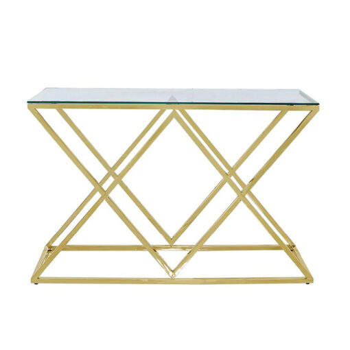 Table console Horizon Geometric X-Frame – Table de couloir en métal doré avec plateau en verre trempé transparent