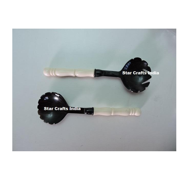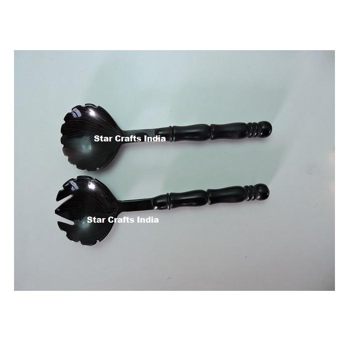 Horn and Long Handle Salad Servers Set Spoon and Fork with Acrylic Aqua Swirl and Black Model Pattern for Kitchen Hotel