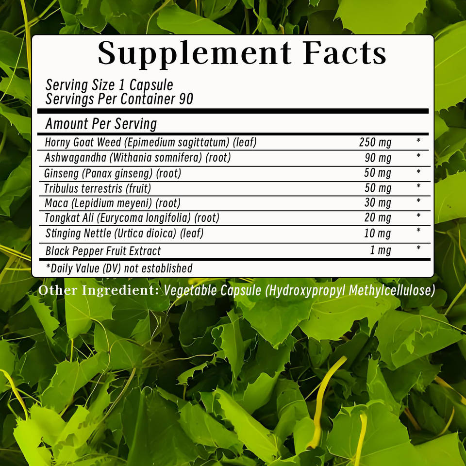 Mauvaises herbes cornées de chèvre, Ashwagandha, Panax Ginseng, Tribulus Terrestris, Racine de Maca, Ortie, Extrait de poivre noirIngrédient principal