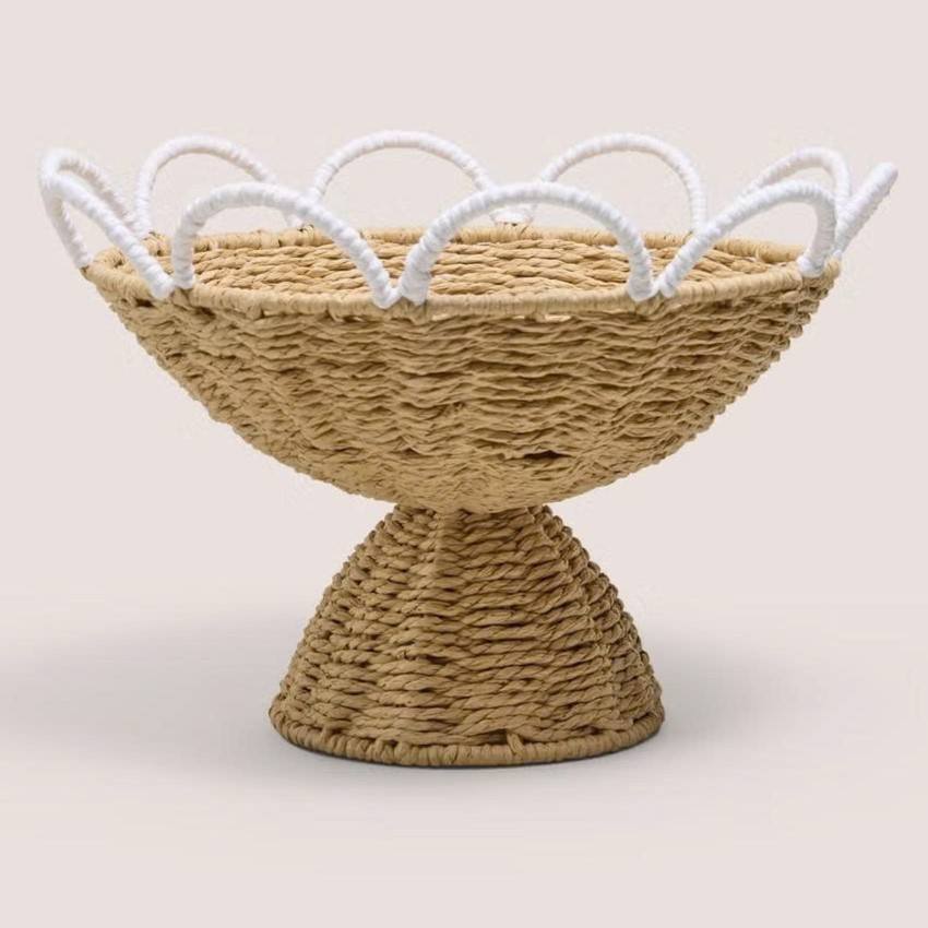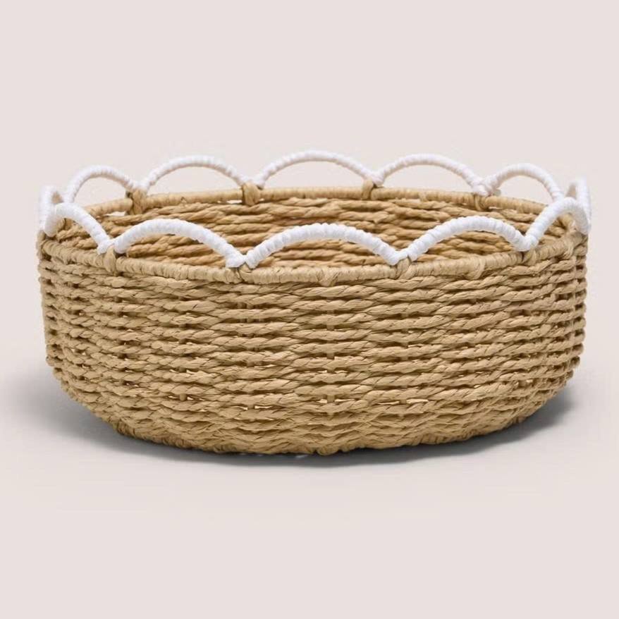 Panier de rangement en jonc de mer à bords festonnés, design tendance, idéal pour organiser les articles essentiels dans le salon.