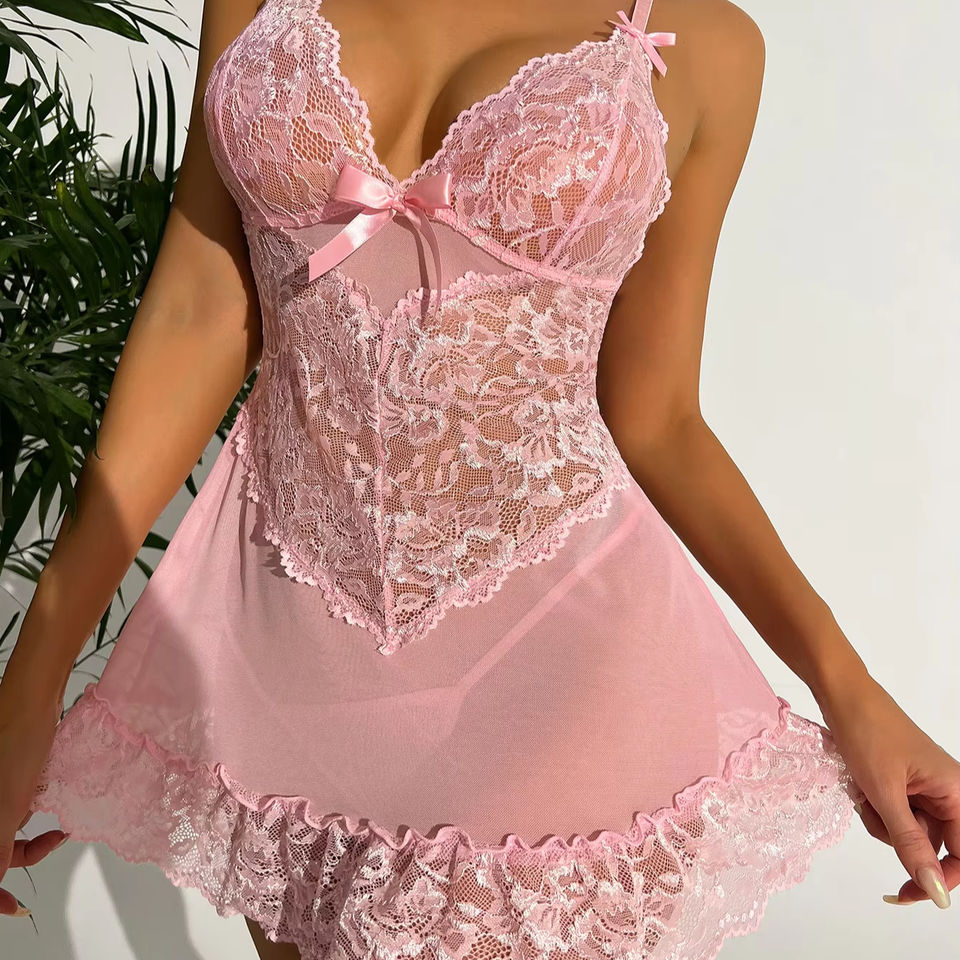 Ensemble de lingerie haut de gamme transparente en dentelle brodée avec nœud sexy en maille pour femme (soutien-gorge et culotte)