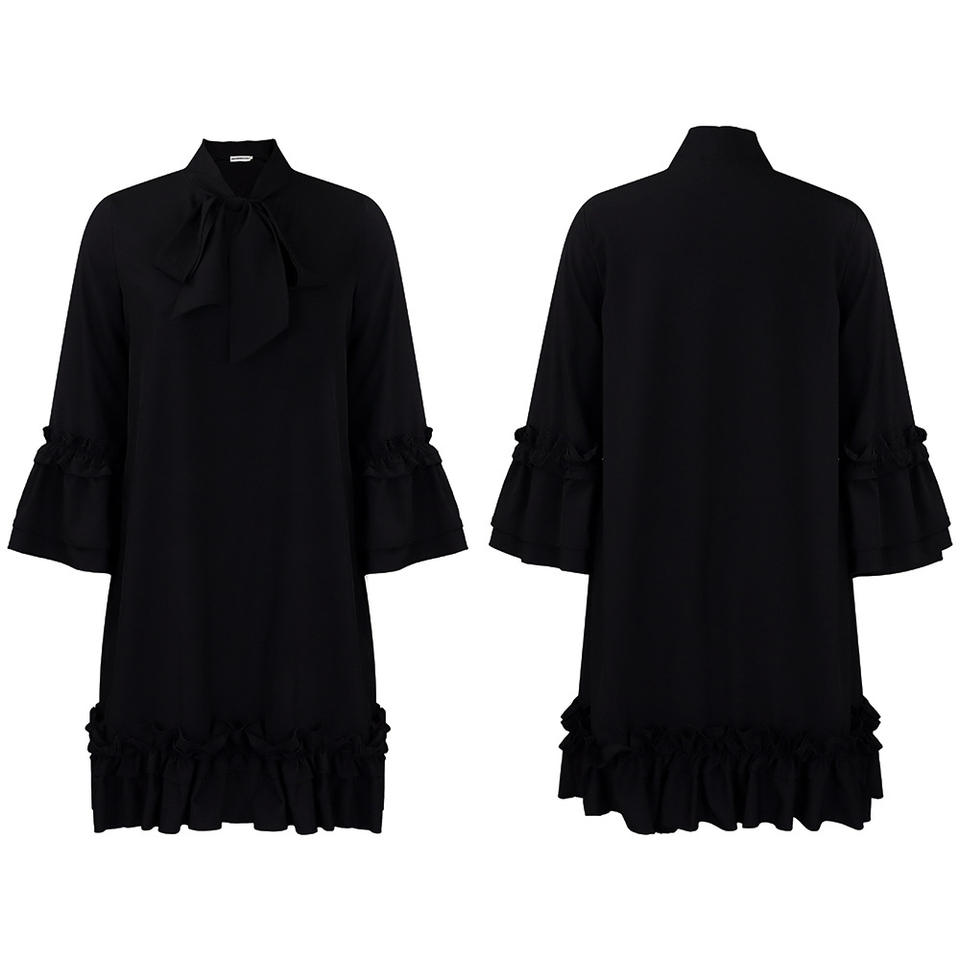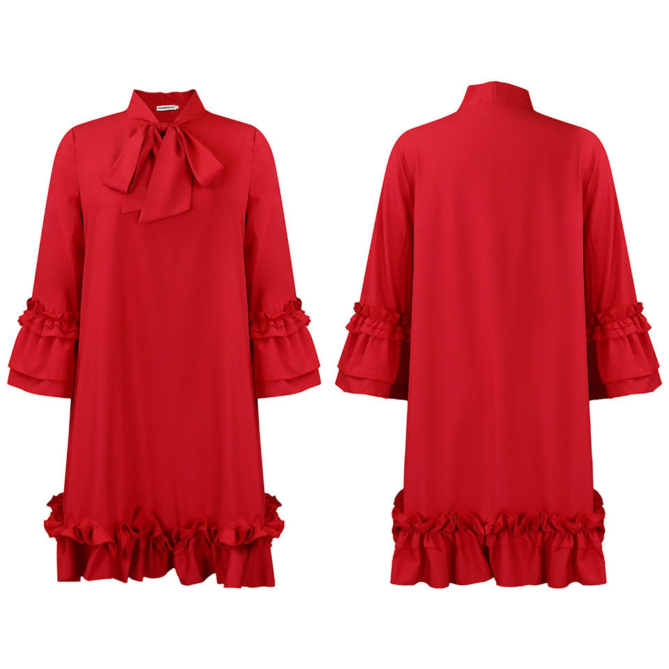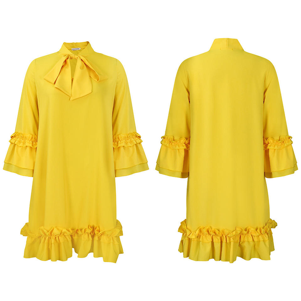 Robe décontractée mi-longue élégante à manches bouffantes, couleur unie, à nouer, à volants, style ample