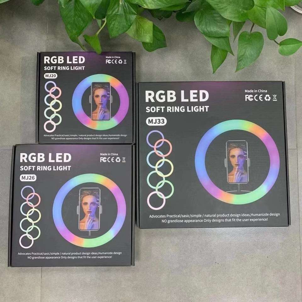 Colorful retail box of MJ33 Photographic RGB Flashing LED Dimmable Lamp Phone Holder Remote Control 13inch Lighting Ring Light with 1.6m Tripod Stand