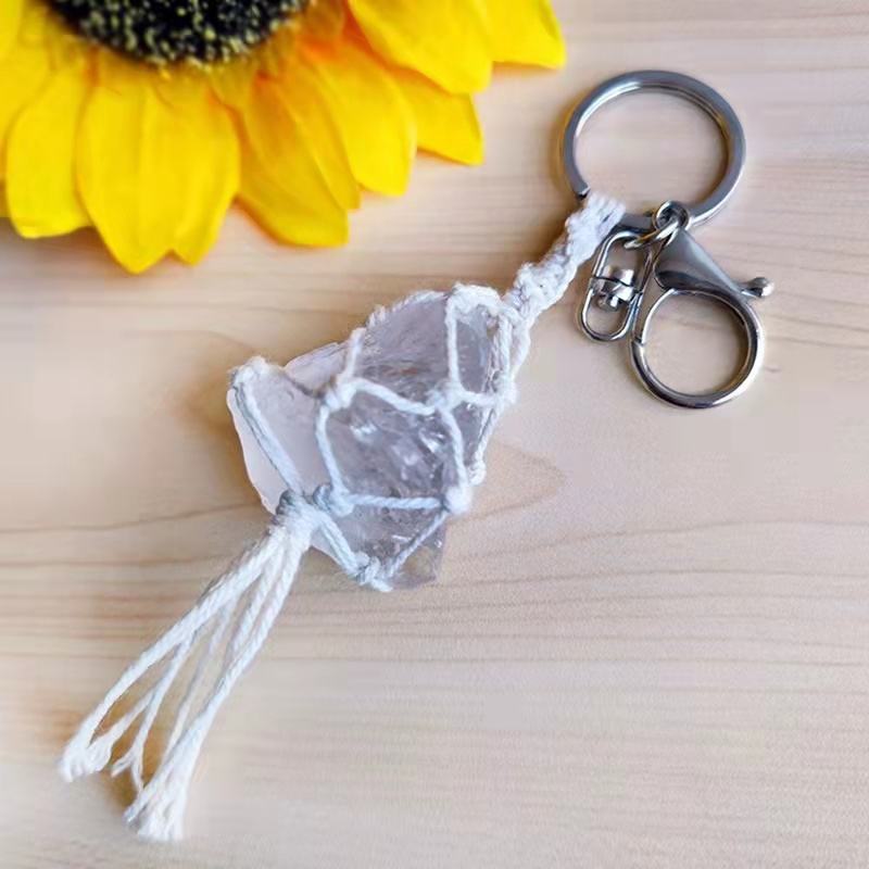 Porte-clés en macramé tendance avec pampille en cristal de quartz naturel irrégulier, énergie de guérison, boucle en corde, pour clés de voiture, pendentif de sac pour femmes et hommes