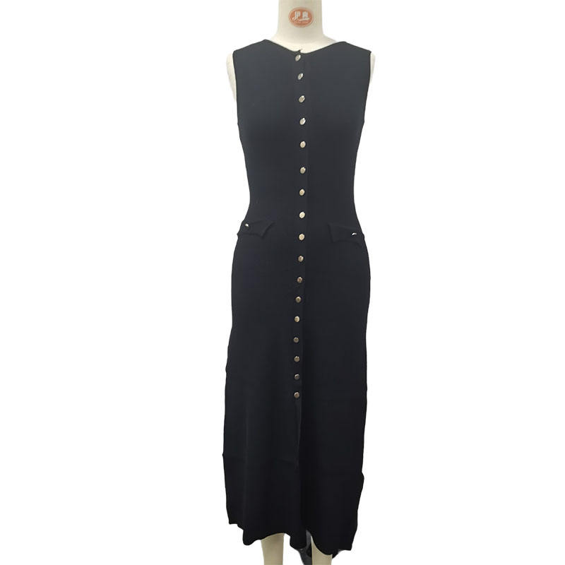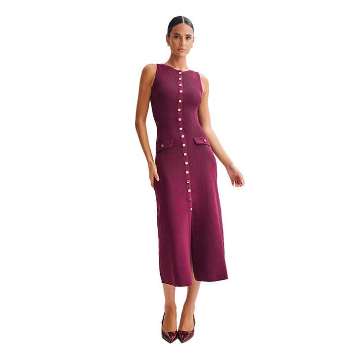 Robe longue en maille élégante et sexy, couleur unie, col rond, sans manches, boutonnée, coupe ajustée, idéale pour les soirées et les clubs.