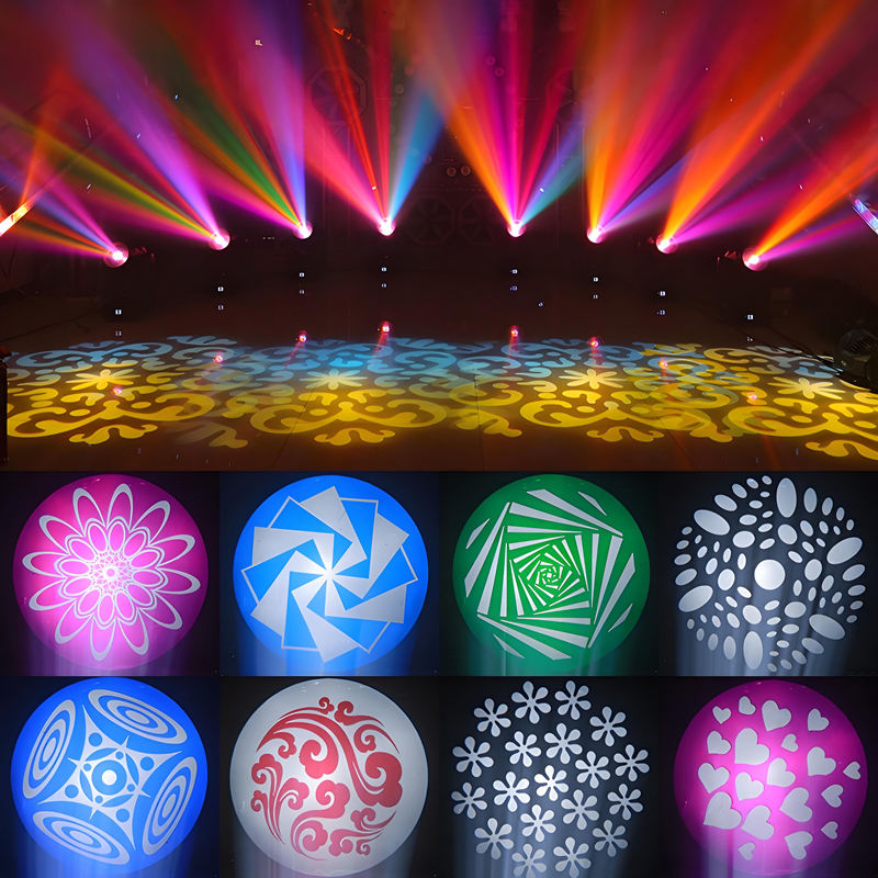 9 gobo fixe + blanc, avec effet de gigue.