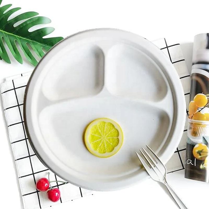 Hot Sale 2024 Ecofriendly Disposable Home Dinner Round 3 Compartment Sugarcane Bagasse Pulp Plate