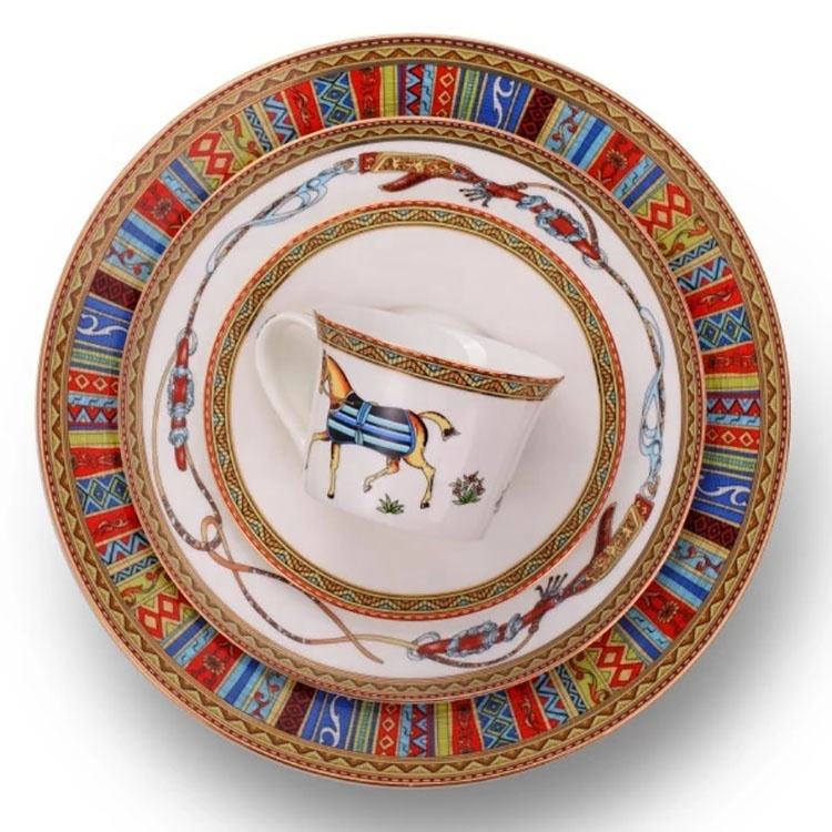 Vente flash : Ensemble de 4 assiettes à dîner en porcelaine fine dorée, style nordique royal, quatre chevaux de guerre