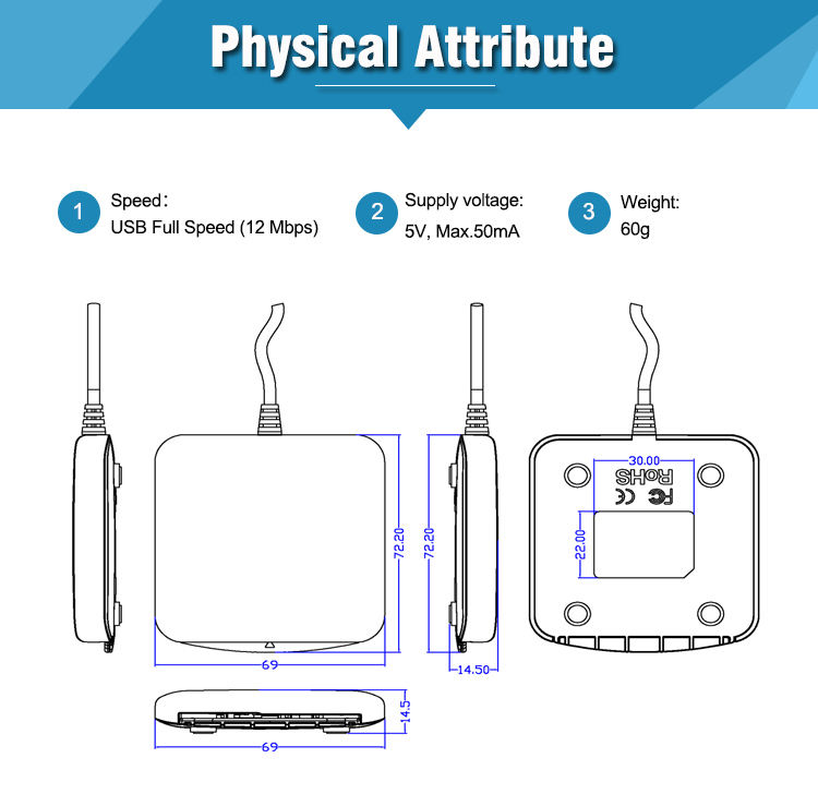 Dimension:72,2 mm (L) x 69,0 mm (l) x 14,0 mm (H)