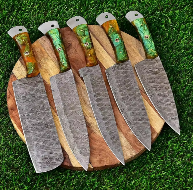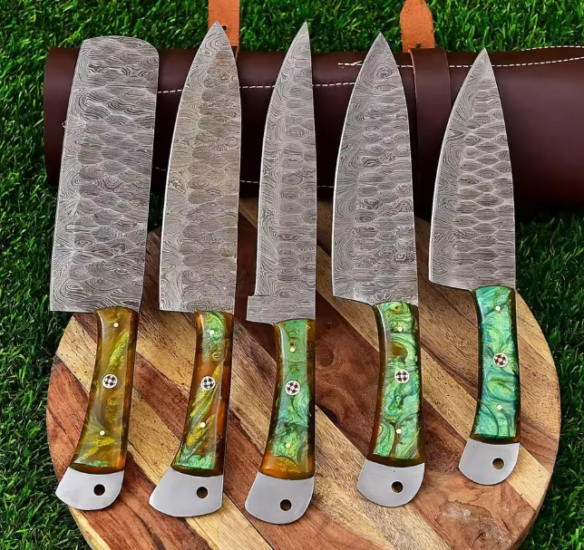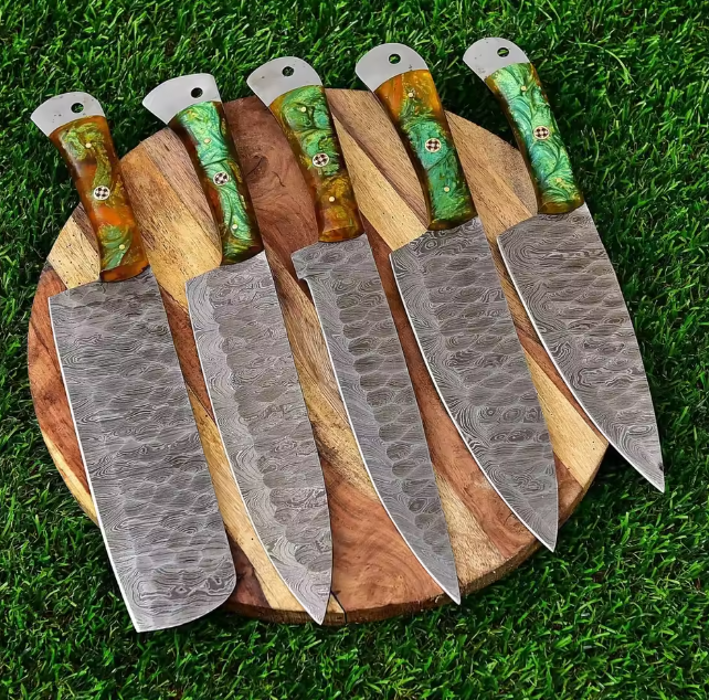 Vente flash : Ensemble de couteaux de chef en acier Damas personnalisé, cinq pièces, ambidextre, lame à 67 couches, finition personnalisée, manche durable, tranchant, le meilleur
