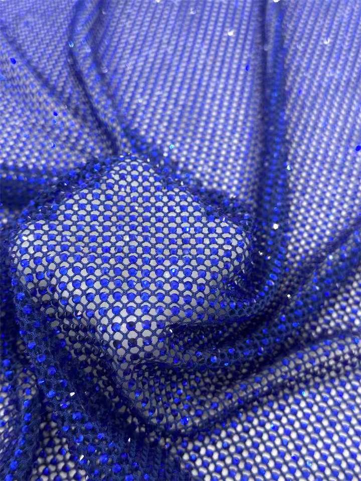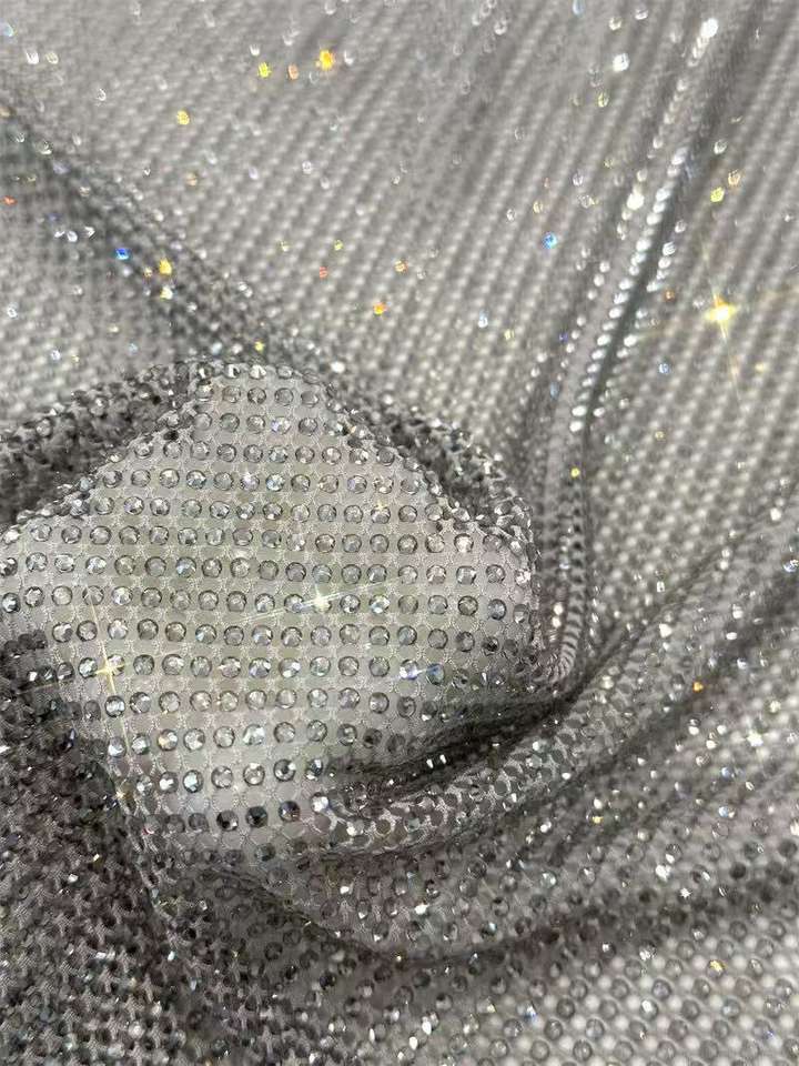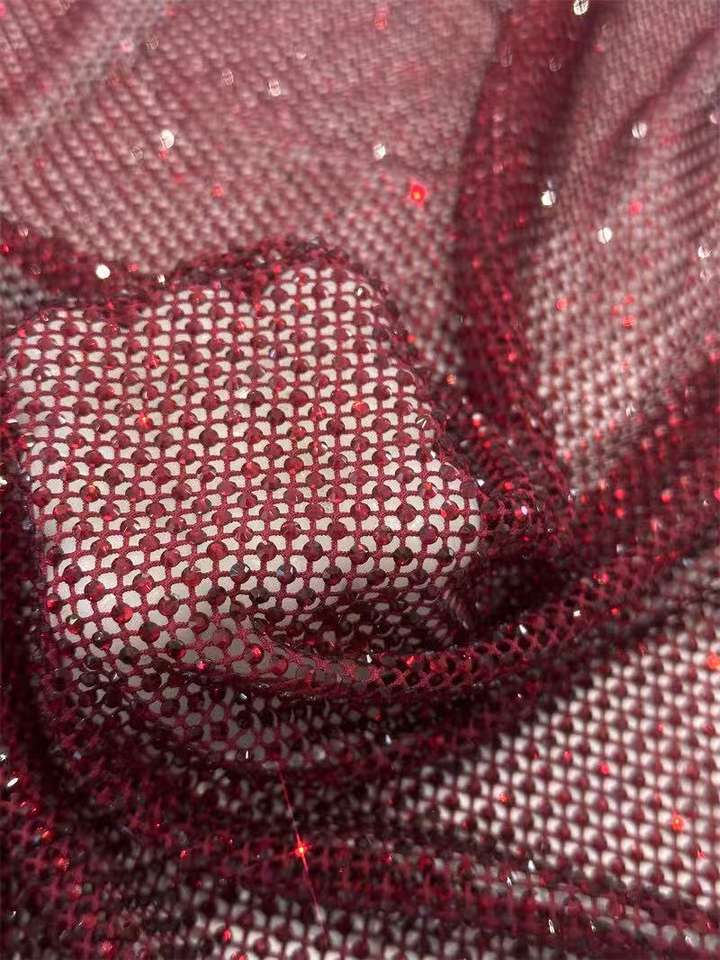 Vente chaude Tissu en dentelle filet de pêche en tulle personnalisé avec strass brillants, strass ronds colorés, pour robe de mariée
